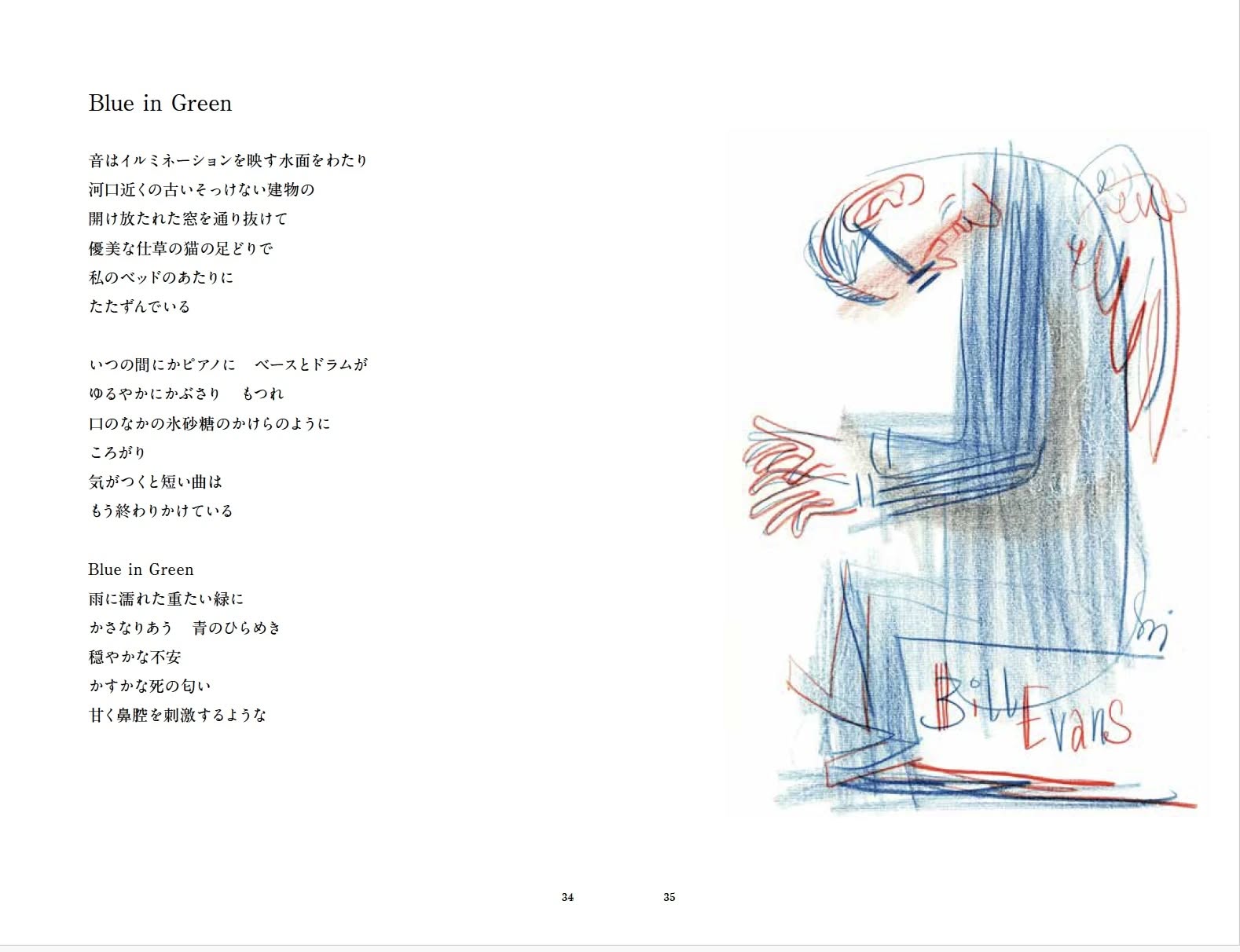 日本攝影評論家飯沢耕太郎推出第五本詩集《SONG BOOK》,以 Bill Evans Trio 的名作《Portrait in Jazz》 為核心主題,為專輯中的每首曲目寫下一篇詩。其中,他談及聆聽〈Blue in Green〉的狀態:「這首演奏擁有清晰鮮明的深度感,彷彿從高空墜下、再度升向天空的流動,使詩的語句自然浮現。」